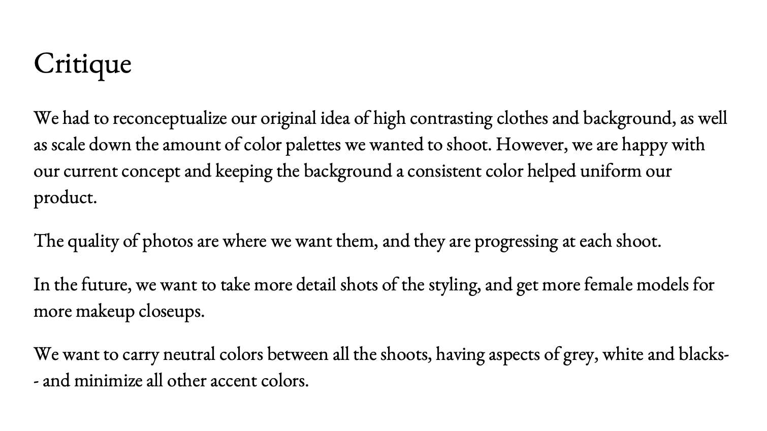 In the winter of 2019, I took a 2 credit course in which I was able to work collaboratively with other individuals. With each of us highlighting different skills, we decided to create a “look book” in which we paired up models with vibrant colors. In this group project my role was to coordinate the shoot, help edit photos, and document the strategy from the beginning to end. Below is the final product we came up with and our strategy on what we felt was best.