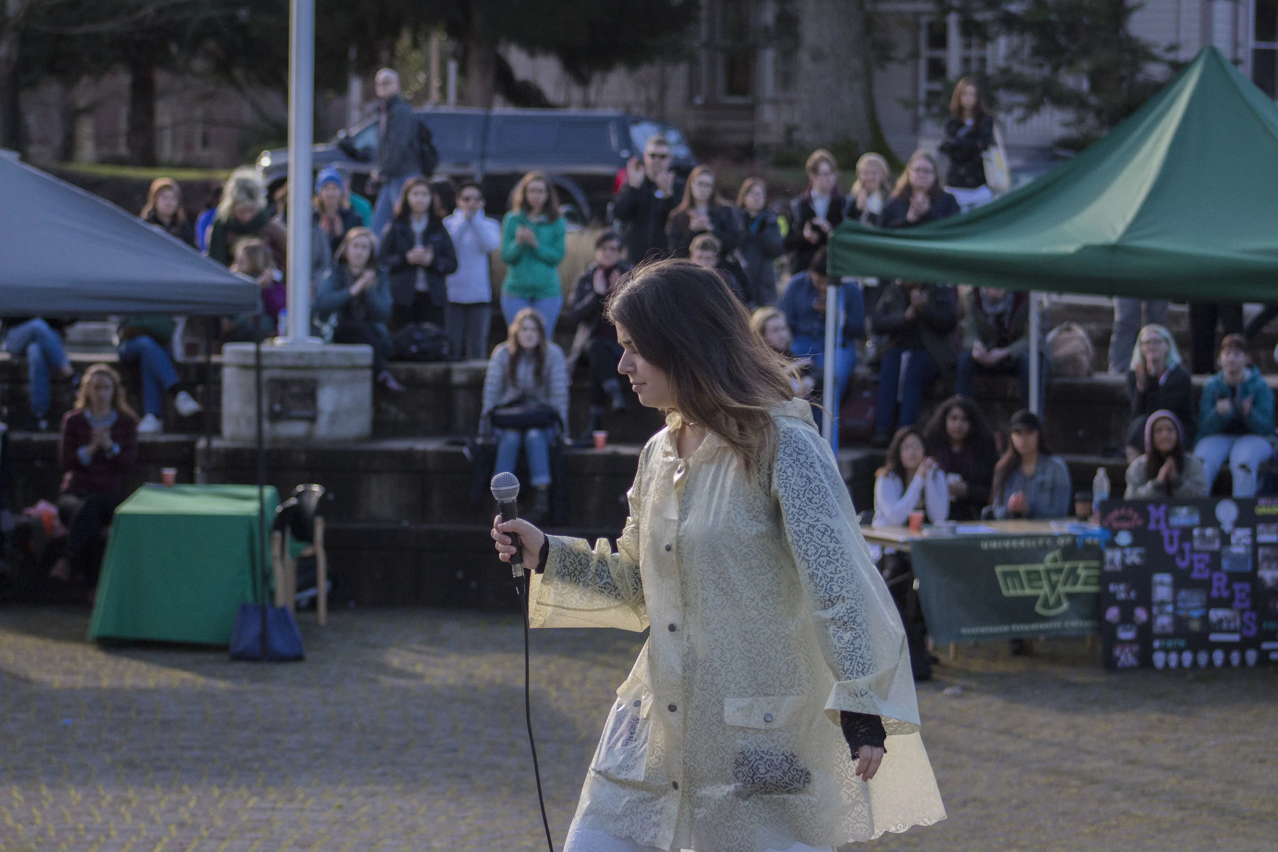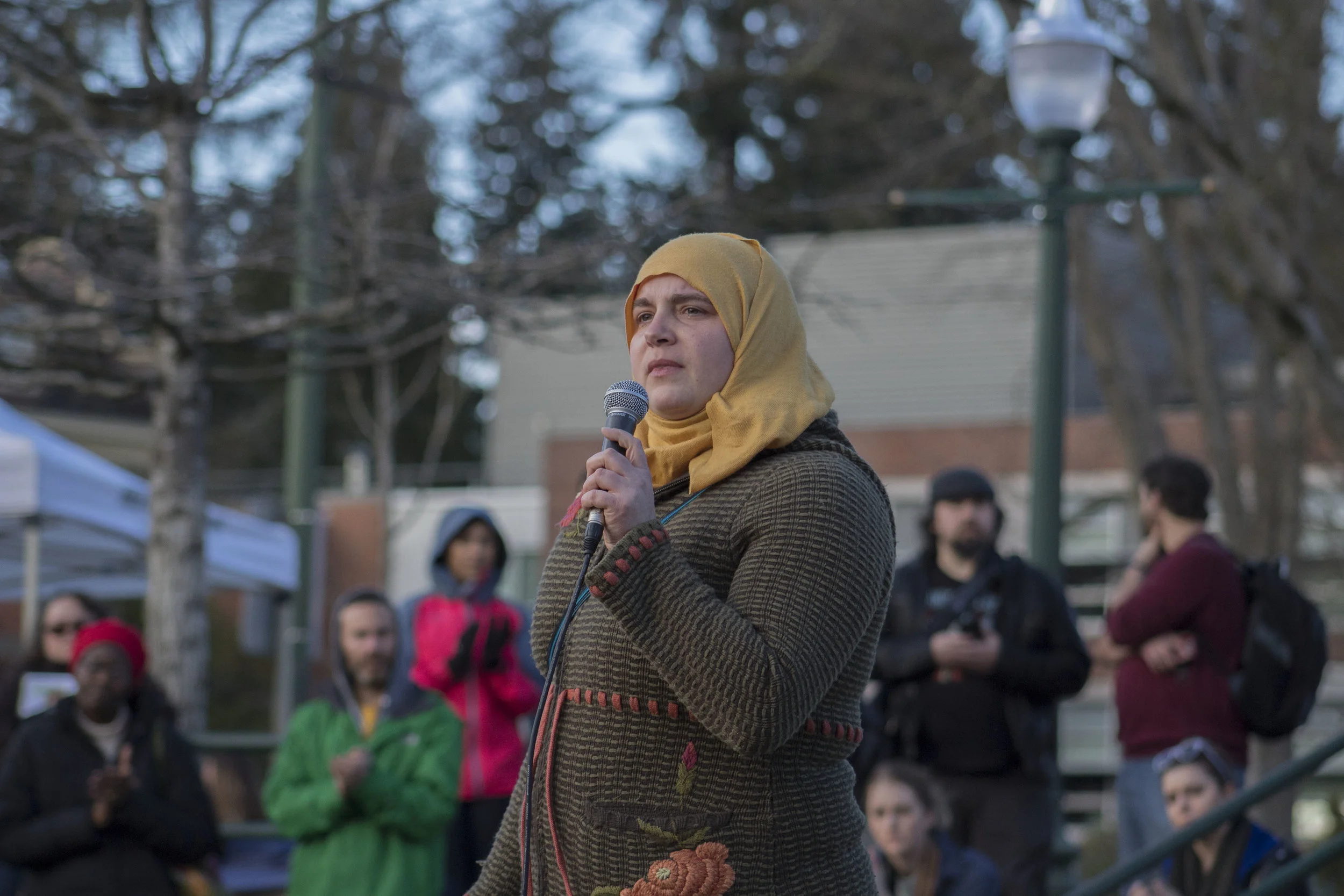 The EMU Amphitheater has a history of being a space for student activism at the University of Oregon. The EMU as well as the amphitheater opened to the public in 1950. During the civil rights movement, student groups such as Movimiento Estudiantil Chicano de Aztlan (M.E.Ch.A) and the Black Student Union held rallies and events in the amphitheater to make others aware of current social issues. In this picture, Muslim and minority students share their testimonies on the importance of community cooperation to stop injustice orders and remarks that were recently made by President Donald Trump.
