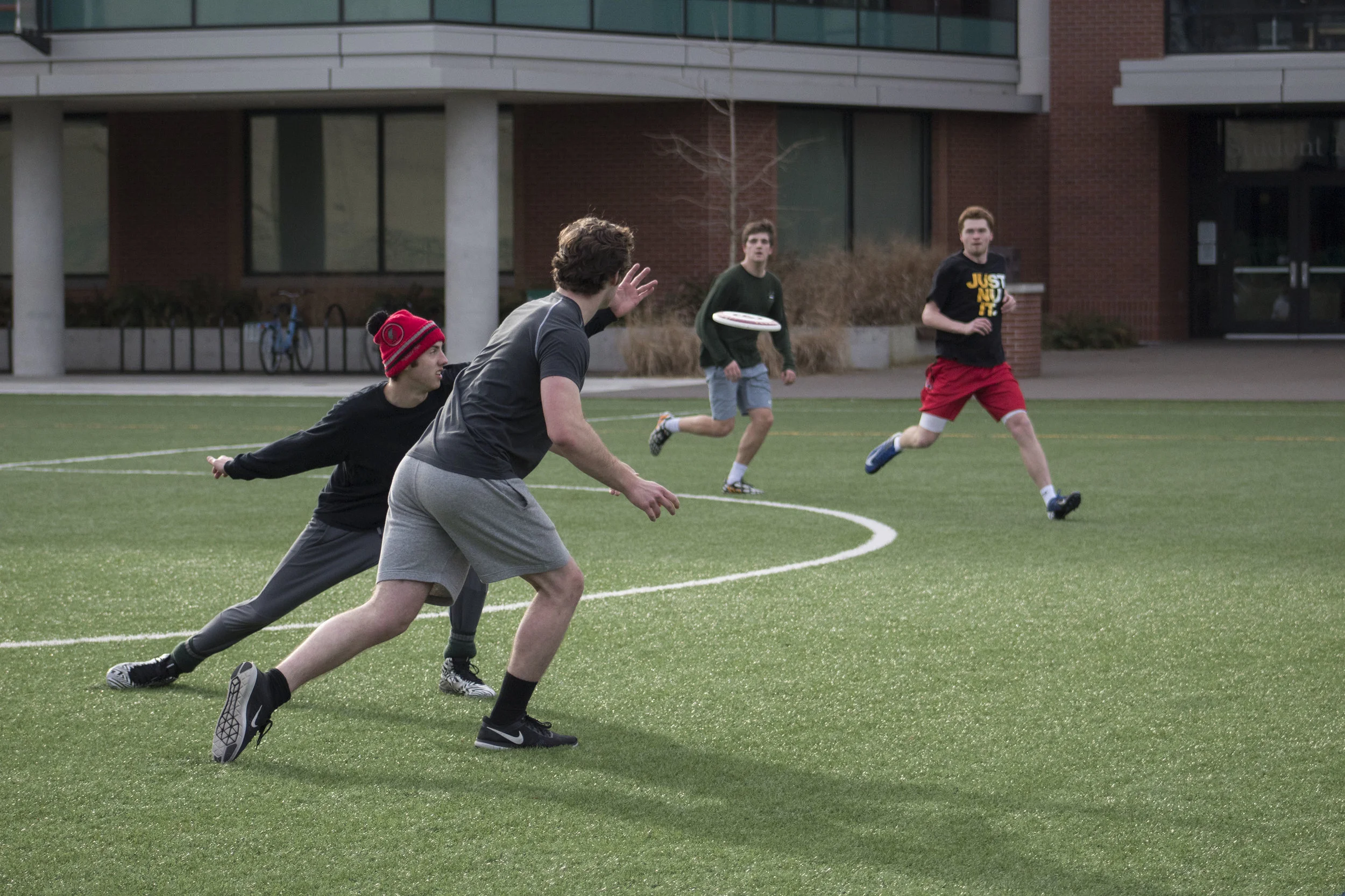A group of students from Sigma Nu Fraternity play a game of Ultimate Frisbee every Saturday on the Recreation center turf fields at the University of Oregon. The Rec center facilities were recently renovated to provide students with more space and equipment.
