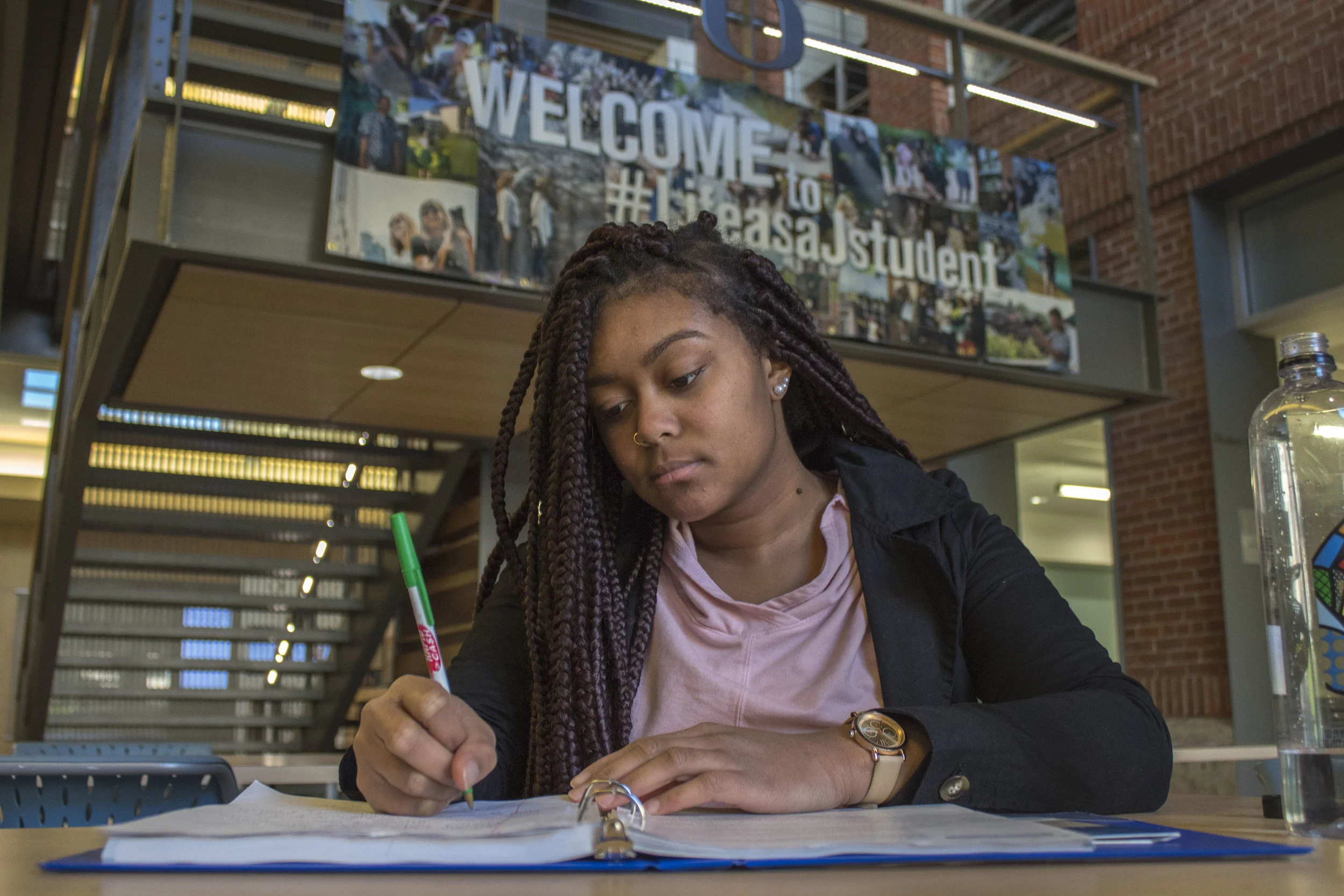 Kenya Spears, 20, studies for an exam in the lounge area of the School of Journalism and Communication. Kenya is one of 493 black students enrolled at the University of Oregon. As an active member of the Black Student Union and Black Women Achievements, Spears says the lack of diversity on campus is upsetting. “I am usually the only black student in all of my journalism classes.”